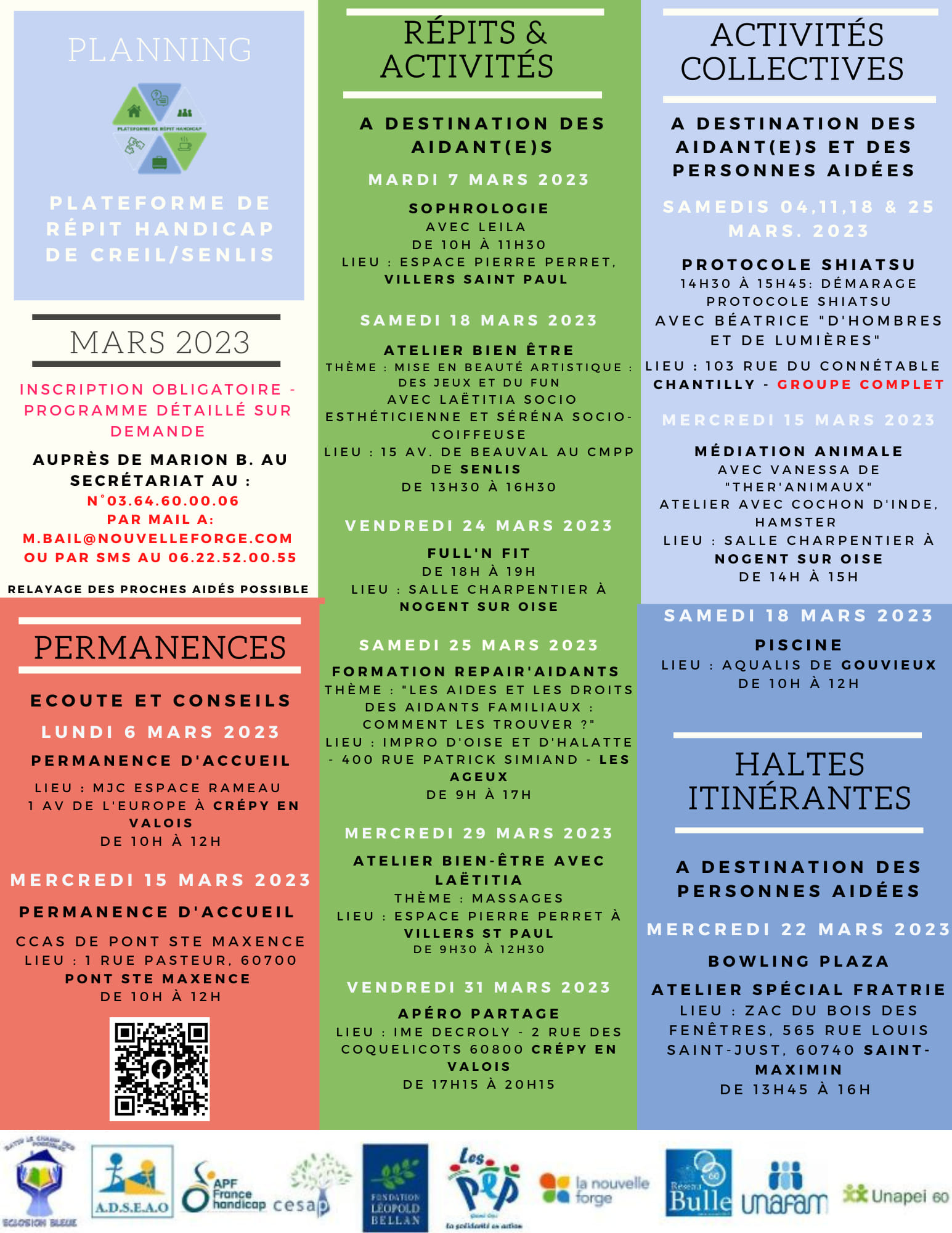 La plate-forme de répit Handicap de Creil/Senlis vous informe de son programme d'activités, ateliers, animations et rendez-vous de mars à avril 2023.